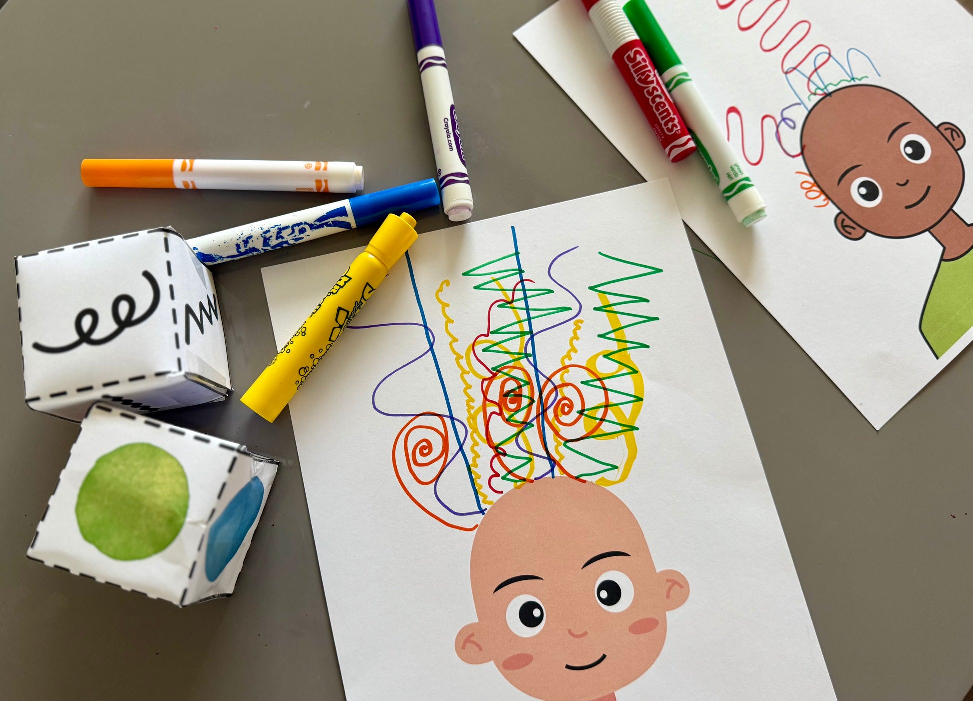 This is such a fun one! All your learner needs are markers or crayons. Their choice! This printable includes a set of dice and three characters to choose from. Be sure to check my TikTok if you're unsure how to assemble the dice. One roll tells you what color to use, the other tells you how to draw the hair!